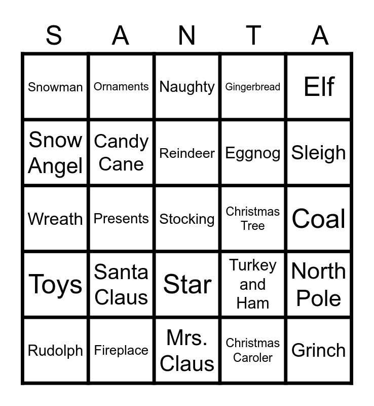 This bingo card has 25 words: Santa Claus, Mrs. Claus, Reindeer, Rudolph, Elf, Snowman, Snow Angel, Ornaments, Christmas Tree, Star, Eggnog, Wreath, Turkey and Ham, North Pole, Candy Cane, Grinch, Coal, Naughty, Sleigh, Presents, Stocking, Fireplace, Toys, Gingerbread and Christmas Caroler.