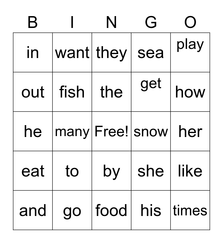 This bingo card has a free space and 24 words: to, go, the, and, play, in, out, want, snow, by, get, he, she, like, fish, his, her, they, how, many, times, eat, sea and food.