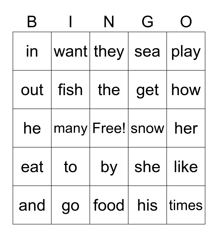 This bingo card has a free space and 24 words: to, go, the, and, play, in, out, want, snow, by, get, he, she, like, fish, his, her, they, how, many, times, eat, sea and food.