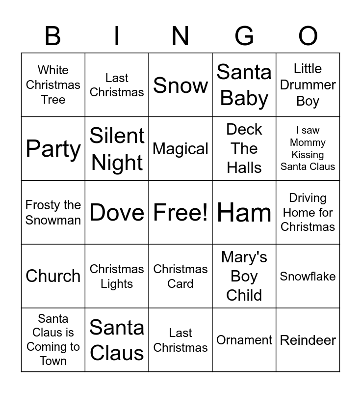 This bingo card has a free space and 71 words: Jingle Bell Rock, Last Christmas, Let It Snow, Feliz Navidad, Last Christmas, All I Want for Christmas is You, Santa Baby, Winter Wonderland, Deck The Halls, Joy to the World, Santa Claus is Coming to Town, Do you Hear what I hear, I saw Mommy Kissing Santa Claus, White Christmas Tree, Blue Christmas, Frosty the Snowman, Mary's Boy Child, Little Drummer Boy, 12 Days of Christmas, Driving Home for Christmas, Christmas Lights, Reindeer, Snowflake, Green, Gold, Bells, Carol, Star, Holiday, Snowman, Santa Claus, Christmas in our Hearts, Happy, Gift, Ornament, Jolly, Rudolph, Angel, Party, Blessing, Christmas Card, Family, Church, Poinsettia, Mistletoe, Red, White, Silent Night, December, Cake, Decoration, Games, Ham, Joy, Love, Music, Magical, Miraculous, Bethlehem, Noel, Nutcracker, Tradition, Dove, Greetings, Rejoice, Socks, Snow, Silver, Three Kings, Vixen and Vacation.