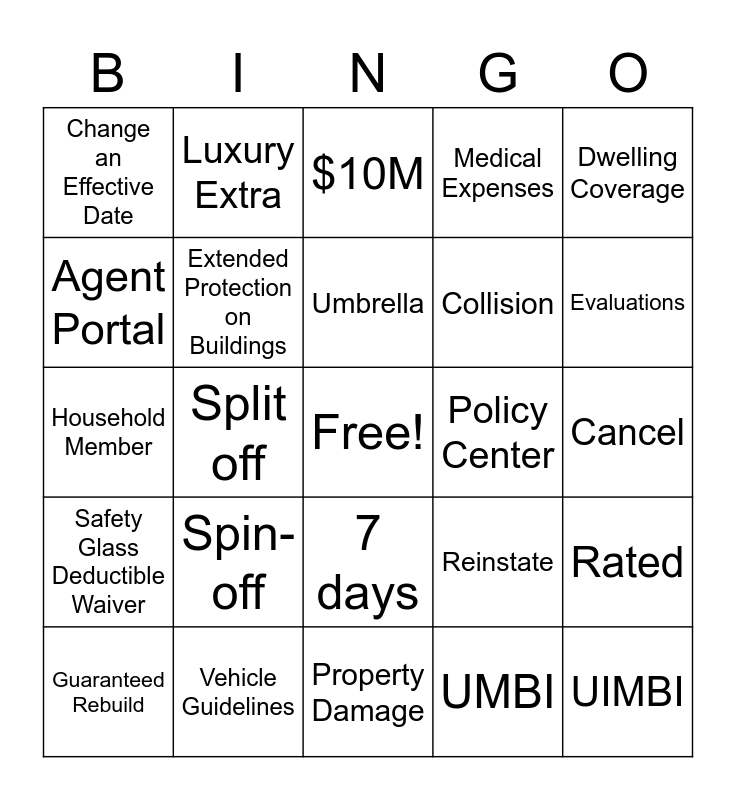 This bingo card has a free space and 34 words: Bodily Injury, UMBI, PIP, $10,000, Safety Glass Deductible Waiver, Extended Protection on Buildings, Dwelling Coverage, Guaranteed Rebuild, Luxury Extra, Blanket Property Limit, Umbrella, $10M, $250k/$500k/$100k, Slander, Policy Center, Evaluations, Vehicle Guidelines, Household Member, Spin-off, Reinstate, 7 days, Create a policy, Change an Effective Date, Cancel, Property Damage, UIMBI, Medical Expenses, Libel, Collision, Agent Portal, Rewrite, Split off, Rated and Usage & Mileage.