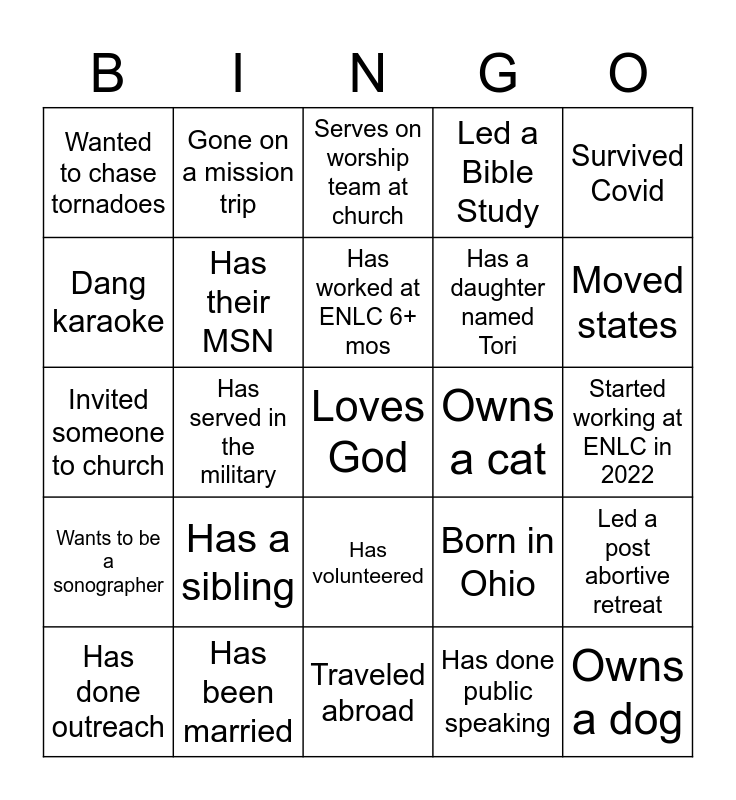 This bingo card has a free space and 24 words: Has done outreach, Has a sibling, Has worked at ENLC 6+ mos, Has done public speaking, Survived Covid, Wanted to chase tornadoes, Gone on a mission trip, Serves on worship team at church, Owns a cat, Started working at ENLC in 2022, Invited someone to church, Has their MSN, Born in Ohio, Led a post abortive retreat, Dang karaoke, Has been married, Traveled abroad, Led a Bible Study, Moved states, Wants to be a sonographer, Has served in the military, Has volunteered, Has a daughter named Tori and Owns a dog.