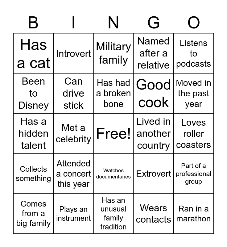 This bingo card has a free space and 24 words: Attended a concert this year, Plays an instrument, Has had a broken bone, Comes from a big family, Listens to podcasts, Has a cat, Been to Disney, Introvert, Lived in another country, Watches documentaries, Good cook, Has a hidden talent, Extrovert, Part of a professional group, Can drive stick, Wears contacts, Loves roller coasters, Military family, Moved in the past year, Met a celebrity, Ran in a marathon, Collects something, Named after a relative and Has an unusual family tradition.