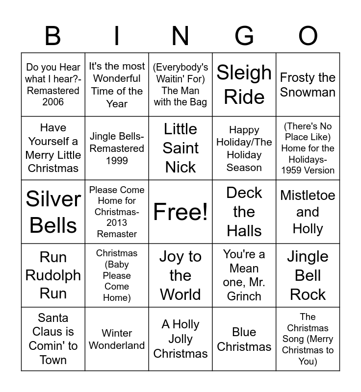 This bingo card has a free space and 49 words: Rockin' Around the Christmas Tree, The Christmas Song (Merry Christmas to You), Let it Snow! Let it Snow! Let it Snow!, A Holly Jolly Christmas, Christmas (Baby Please Come Home), White Christmas, It's the most Wonderful Time of the Year, Feliz Navidad, Have Yourself a Merry Little Christmas, It's Beginning to Look a lot like Christmas, Jingle Bells- Remastered 1999, Sleigh Ride, Jingle Bell Rock, You're a Mean one, Mr. Grinch, Here Comes Santa Claus (Right Down Santa Clause Lane), Santa Baby, Little Saint Nick, Deck the Halls, Mele Kalikimaka (Merry Christmas), Frosty the Snowman, Please Come Home for Christmas- 2013 Remaster, Blue Christmas, Do you Hear what I hear?- Remastered 2006, Happy Holiday/The Holiday Season, Silver Bells, (There's No Place Like) Home for the Holidays- 1959 Version, Santa Claus is Comin' to Town, Rudolph the Red-Nosed Reindeer, Joy to the World, Run Rudolph Run, Baby, it's Cold Outside, All I want for Christmas is You, Santa Claus is Coming to Town, Christmas (Baby Please Come Home), Winter Wonderland, I Saw Mommy Kissing Santa Claus, We Wish you a Merry Christmas, Twelve Days of Christmas, Mistletoe and Holly, This Christmas, I'll be Home for Christmas, Baby, it's Cold Outside, The Little Drummer Boy- Remastered 2006, Joy to the world, Silver Bells, (Everybody's Waitin' For) The Man with the Bag, Little Saint Nick, Winter Wonderland and Here Comes Santa Claus (Right Down Santa Claus Lane)- 1947 Version.