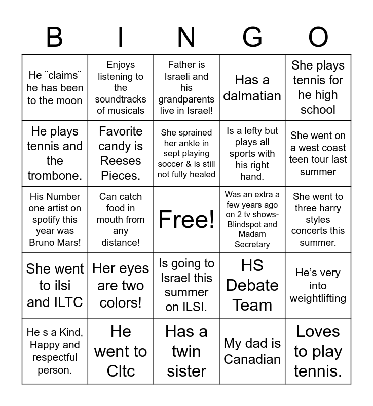 This bingo card has a free space and 25 words: Her eyes are two colors!, Has a twin sister, She sprained her ankle in sept playing soccer & is still not fully healed, He s a Kind, Happy and respectful person., She plays tennis for he high school, He ¨claims¨ he has been to the moon, He plays tennis and the trombone., Enjoys listening to the soundtracks of musicals, Was an extra a few years ago on 2 tv shows- Blindspot and Madam Secretary, Is going to Israel this summer on ILSI., Is a lefty but plays all sports with his right hand., His Number one artist on spotify this year was Bruno Mars!, HS Debate Team, He’s very into weightlifting, Favorite candy is Reeses Pieces., He is going to High Point University next year!, She went to three harry styles concerts this summer., Father is Israeli and his grandparents live in Israel!, She went on a west coast teen tour last summer, Can catch food in mouth from any distance!, Loves to play tennis., He went to Cltc, She went to ilsi and ILTC, Has a dalmatian and My dad is Canadian.