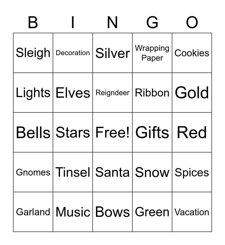 This bingo card has a free space and 24 words: Tinsel, Music, Reigndeer, Garland, Cookies, Sleigh, Lights, Decoration, Gifts, Santa, Ribbon, Bells, Snow, Spices, Elves, Green, Red, Silver, Gold, Stars, Vacation, Gnomes, Wrapping Paper and Bows.