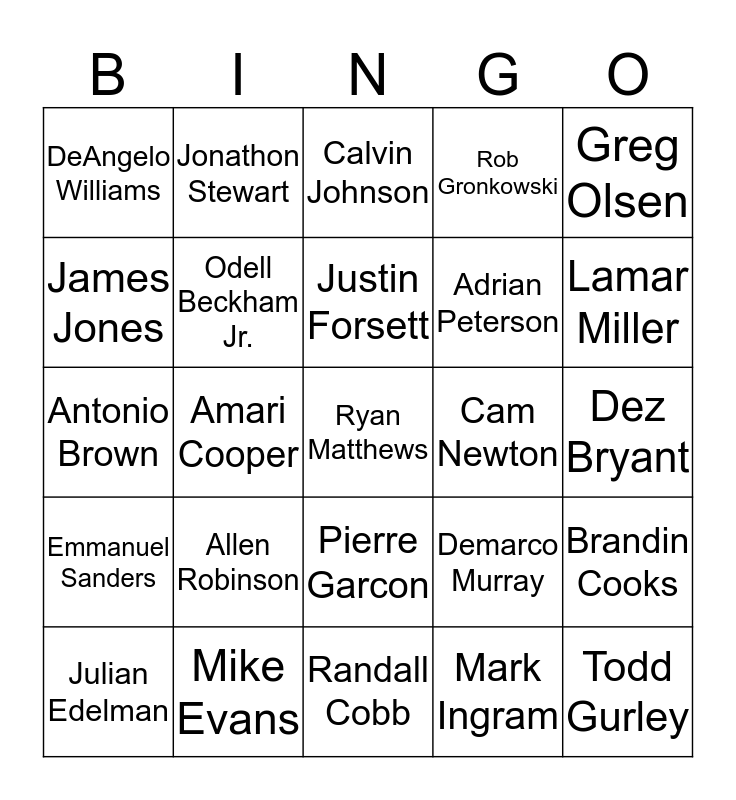 This bingo card has 25 words: Allen Robinson, Randall Cobb, Justin Forsett, Julian Edelman, Greg Olsen, DeAngelo Williams, James Jones, Jonathon Stewart, Cam Newton, Pierre Garcon, Adrian Peterson, Antonio Brown, Demarco Murray, Brandin Cooks, Odell Beckham Jr., Todd Gurley, Dez Bryant, Calvin Johnson, Lamar Miller, Amari Cooper, Ryan Matthews, Mike Evans, Emmanuel Sanders, Rob Gronkowski and Mark Ingram.
