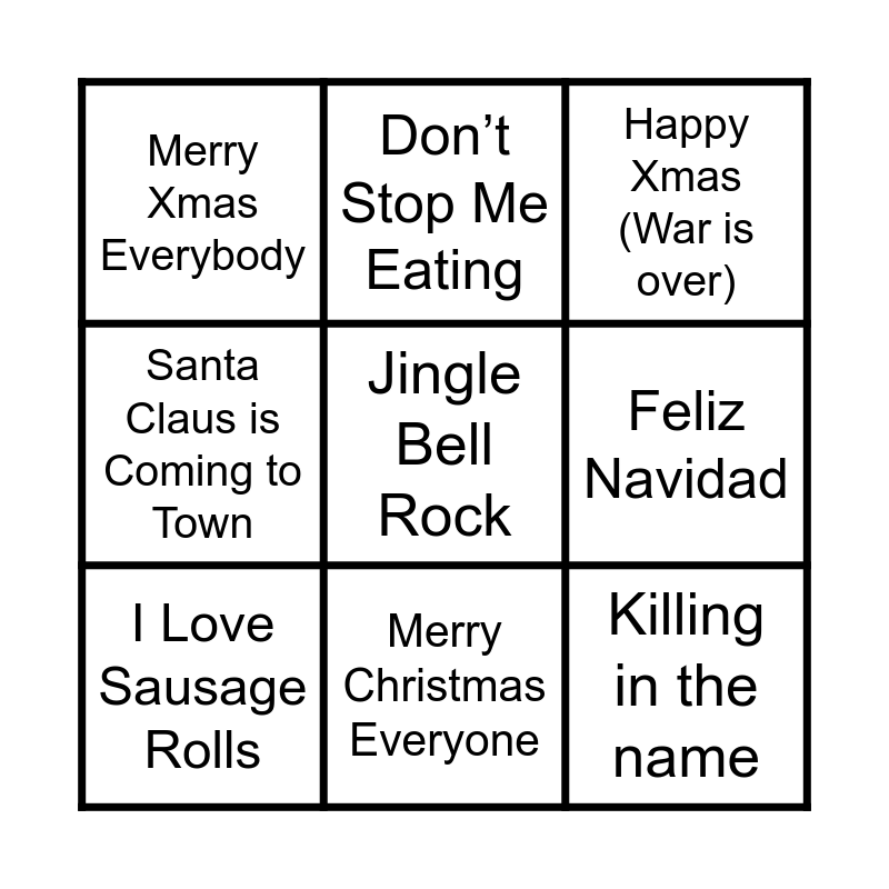 This bingo card has 13 words: Build me up Buttercup, Don't You Want me Baby, I Love Sausage Rolls, Don’t Stop Me Eating, Santa Claus is Coming to Town, Jingle Bell Rock, Killing in the name, Daytripper, Merry Christmas Everyone, Merry Xmas Everybody, Feliz Navidad, Happy Xmas (War is over) and Band Aid.
