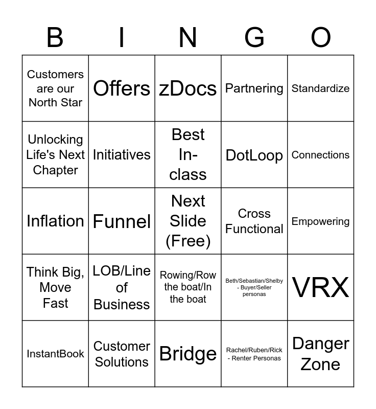 This bingo card has a free space and 73 words: Own It, Turn on The Lights, Customers are our North Star, Do the Right Thing, Better Together, Include and Empower, Think Big, Move Fast, Deliver Quality on Time, Every Time, Beth/Sebastian/Shelby - Buyer/Seller personas, Alan, Irene/Harriet - Investor/Homeowner personas, Tour, Initiatives, Empowering, Exciting, Offers, Bridge, Unlocking Life's Next Chapter, Really Good Place, Cross Functional, Best In-class, Partnering, Standardize, Execution, InstantBook, Super App, ZHL, Mortgages, Bruh, Reorg, Customer Solutions, Find the One, Test Kitchen, Strategy, Funnel, Insights, Voice of the Customer, Integrated Buying Experience, Danger Zone, Innovation, Rachel/Ruben/Rick - Renter Personas, LOB/Line of Business, Subgraph/GraphQL, ZConnect, PA/Premier Agent, DotLoop, zDocs, ZCS/Zillow Closing Service, 4 Day Work Week, Inflation, Compensation, Equity, zRes/Zillow Real Estate Software, One Zillow, RMX, Go to Market, Zillow 2.0, Rowing/Row the boat/In the boat, AI/ML, StreetEasy, ShowingTime/ShowingTime 2.0/ShowingTime+, OpenDoor, Build Together Summit, Connections, Spotlight, Showcase, Competitive, ZallWay, VRX, Survey, You know, Engagement and Acorns.