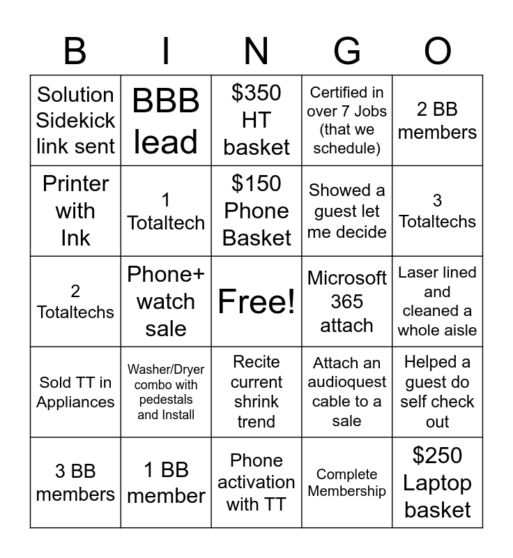 This bingo card has a free space and 24 words: Washer/Dryer combo with pedestals and Install, 1 BB member, $150 Phone Basket, 3 BB members, 2 BB members, Solution Sidekick link sent, Printer with Ink, BBB lead, Microsoft 365 attach, Recite current shrink trend, Showed a guest let me decide, 2 Totaltechs, Attach an audioquest cable to a sale, Helped a guest do self check out, 1 Totaltech, Complete Membership, Laser lined and cleaned a whole aisle, $350 HT basket, 3 Totaltechs, Phone+ watch sale, $250 Laptop basket, Sold TT in Appliances, Certified in over 7 Jobs (that we schedule) and Phone activation with TT.
