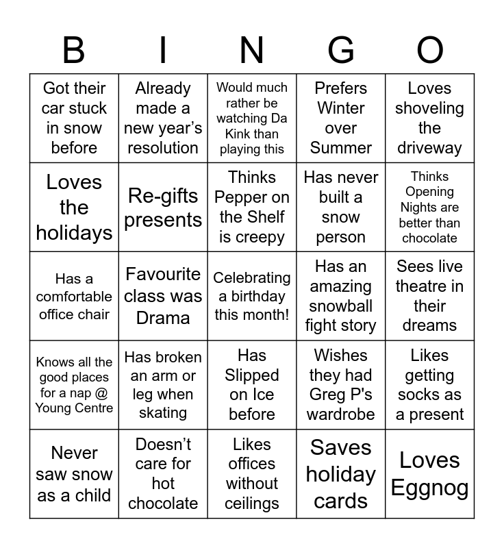 This bingo card has a free space and 24 words: Never saw snow as a child, Has broken an arm or leg when skating, Thinks Pepper on the Shelf is creepy, Saves holiday cards, Loves shoveling the driveway, Got their car stuck in snow before, Already made a new year’s resolution, Would much rather be watching Da Kink than playing this, Has an amazing snowball fight story, Sees live theatre in their dreams, Has a comfortable office chair, Re-gifts presents, Wishes they had Greg P's wardrobe, Likes getting socks as a present, Loves the holidays, Doesn’t care for hot chocolate, Likes offices without ceilings, Prefers Winter over Summer, Thinks Opening Nights are better than chocolate, Knows all the good places for a nap @ Young Centre, Favourite class was Drama, Has Slipped on Ice before, Has never built a snow person and Loves Eggnog.