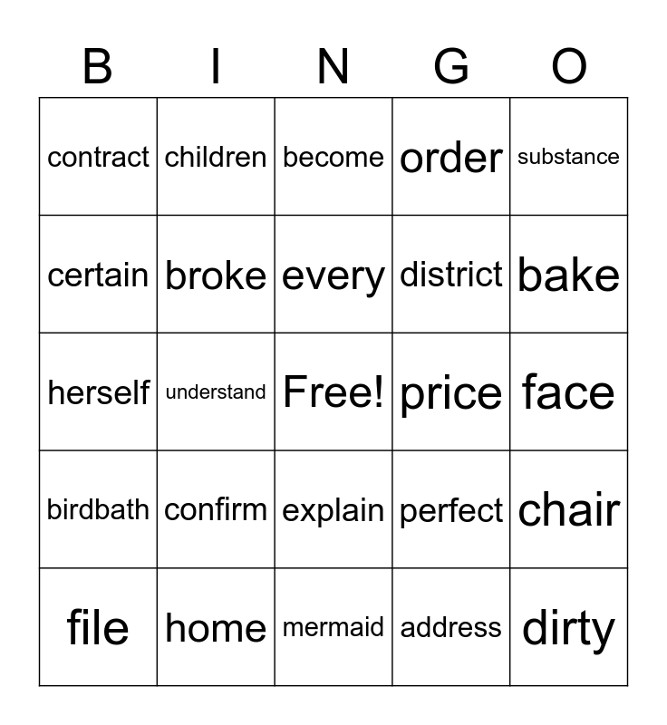 This bingo card has a free space and 75 words: warm, third, become, hundred, thirsty, early, telephone, purchase, during, world, arrive, complete, every, certain, June, understand, Thursday, dirty, huge, substance, forty, herself, broke, children, order, earth, ride, explore, learner, word, sale, control, sermon, perfect, bake, district, birth, verb, face, address, clerk, determine, frame, embrace, error, commercial, file, contract, consumer, whirlwind, spoke, explain, wear, worthwhile, vote, single, surprise, virtual, swipe, improve, confirm, workout, brave, manager, earthquake, price, return, purpose, rule, chair, birdbath, home, December, mermaid and date.