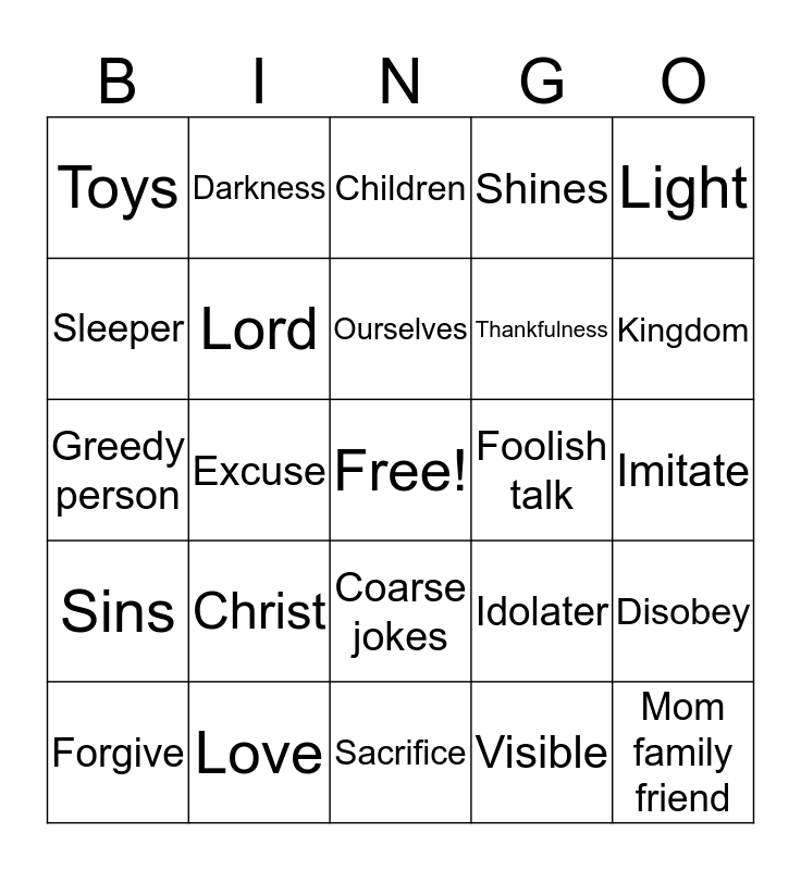 This bingo card has a free space and 25 words: Christ, Sacrifice, Ourselves, Forgive, Light, Toys, Sleeper, Darkness, Foolish talk, Coarse jokes, Thankfulness, Greedy person, Idolater, Disobey, Lord, Give, Imitate, Children, Kingdom, Excuse, Mom family friend, Love, Sins, Shines and Visible.