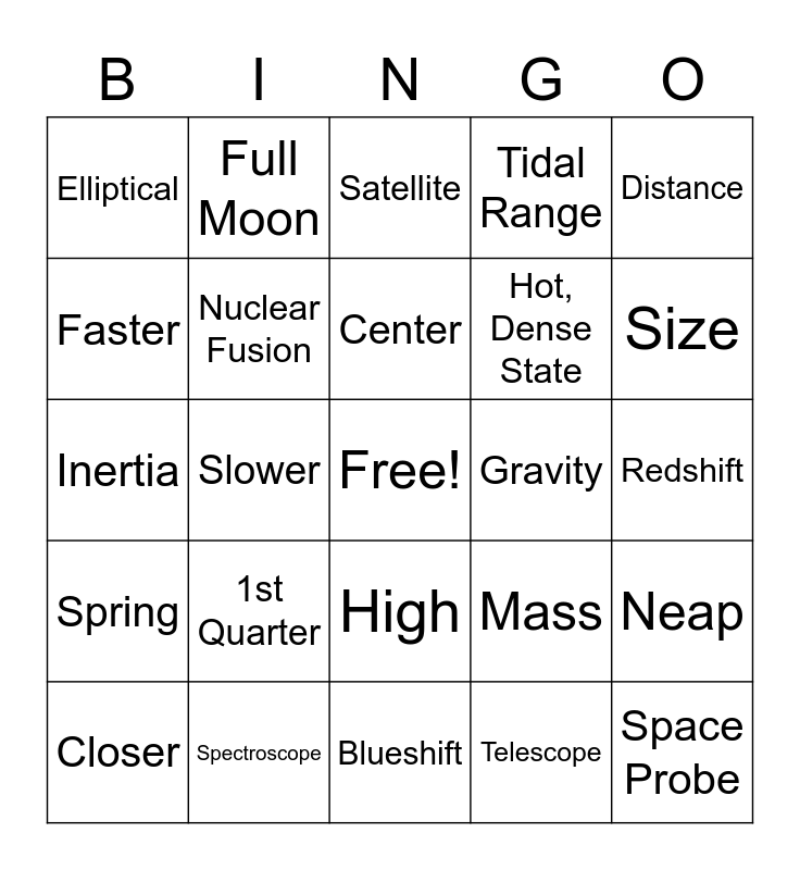 This bingo card has a free space and 25 words: 1st Quarter, Blueshift, Center, Closer, Distance, Elliptical, Faster, Full Moon, Gravity, High, Hot, Dense State, Inertia, Mass, Neap, Nuclear Fusion, Pressure, Redshift, Satellite, Size, Slower, Space Probe, Spectroscope, Spring, Tidal Range and Telescope.