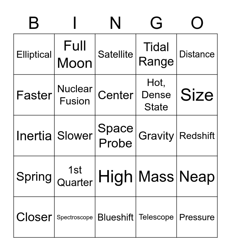 This bingo card has 25 words: 1st Quarter, Blueshift, Center, Closer, Distance, Elliptical, Faster, Full Moon, Gravity, High, Hot, Dense State, Inertia, Mass, Neap, Nuclear Fusion, Pressure, Redshift, Satellite, Size, Slower, Space Probe, Spectroscope, Spring, Tidal Range and Telescope.