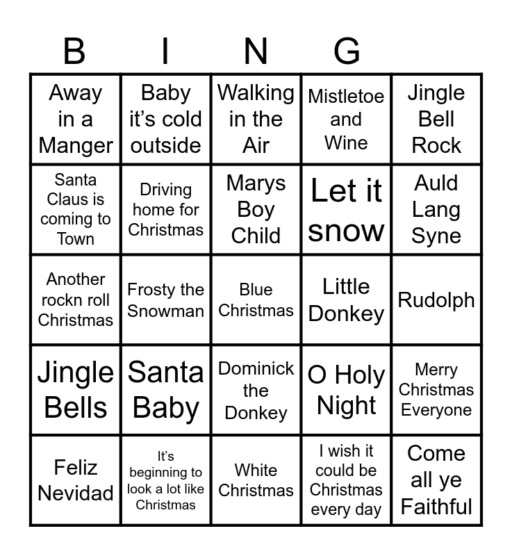 This bingo card has 37 words: All I want for Christmas, Last Christmas, Fairy tale of New York, Driving home for Christmas, Merry Christmas Everyone, Santa Baby, Marys Boy Child, Rockin around the Christmas Tree, Jingle Bell Rock, Silent Night, Frosty the Snowman, Mistletoe and Wine, Blue Christmas, Rudolph, Santa Claus is coming to Town, Jingle Bells, 12 days of Christmas, Walking in the Air, Dominick the Donkey, Little Donkey, Away in a Manger, Auld Lang Syne, Feliz Nevidad, White Christmas, Deck the halls, I wish it could be Christmas every day, Baby it’s cold outside, Winter wonderland, Lonely this Christmas, Do they know it’s Christmas, We wish you a Merry Christmas, It’s beginning to look a lot like Christmas, Another rockn roll Christmas, Come all ye Faithful, O Holy Night, Let it snow and Mambo Santa.