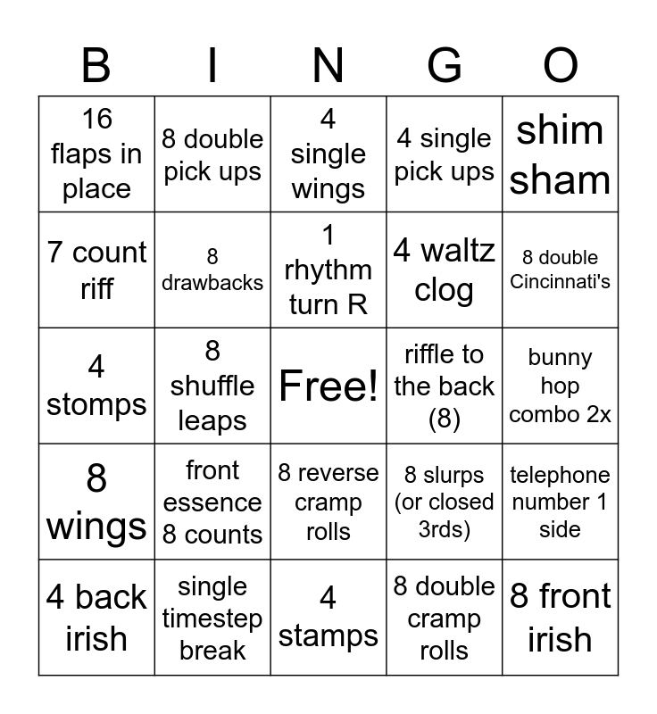 This bingo card has a free space and 44 words: 4 maxifords right, 8 front irish, 8 shuffle ballchange, 4 back irish, 8 slaps right, 8 double cramp rolls, 4 single wings, 8 grab offs on toes, shim sham, single timestep break, 4 single pick ups, riffle to the back (8), 8 reverse cramp rolls, front essence 8 counts, grapevine right, 4 stamps, 8 reverse paddles, 4 stomps, 4 press cramp rolls to the right, 8 double Cincinnati's, 8 double pick ups, 8 paddles, 8 flap heels, 16 flaps in place, 4 cramp roll turns, bunny hop combo 2x, single timestep, 5 count riff, 8 slurps (or closed 3rds), 8 wings, 4 buffalos left, telephone number 1 side, 8 cramp rolls, 4 toe stands, 8 shuffle leaps, 8 alt shiggy bops, traveling timestep, 8 flap ballchange, 1 rhythm turn R, 7 count riff, 4 waltz clog, 3 count riff, 8 drawbacks and 8 single Cincinnati's.
