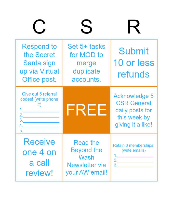 This bingo card has a free space and 8 words: Give out 5 referral codes! (write phone #) 1._______________ 2._______________ 3._______________ 4._______________ 5._______________, Set 5+ tasks for MOD to merge duplicate accounts., Acknowledge 5 CSR General daily posts for this week by giving it a like!, Receive one 4 on a call review!, Submit 10 or less refunds, Respond to the Secret Santa sign up via Virtual Office post., Read the Beyond the Wash Newsletter via your AW email! and Retain 3 memberships! (write emails) 1.________________ 2.________________ 3.________________.