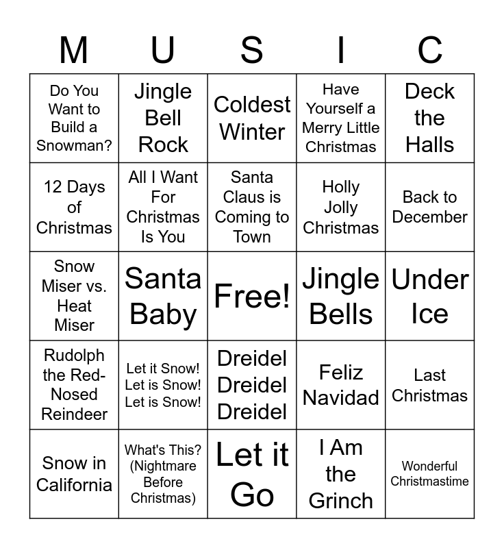 This bingo card has a free space and 33 words: Winter Wonderland, Frosty the Snowman, Santa Baby, The Hanukkah Song, Rudolph the Red-Nosed Reindeer, All I Want For Christmas Is You, Deck the Halls, Snow in California, Jingle Bell Rock, Happy Xmas (War is Over), Santa Claus is Coming to Town, Coldest Winter, You're a Mean One, Mr. Grinch, Immigrant Song, Jingle Bells, Back to December, What's This? (Nightmare Before Christmas), Snow Miser vs. Heat Miser, Let it Snow! Let is Snow! Let is Snow!, Feliz Navidad, Dreidel Dreidel Dreidel, Mele Kalikimaka, Do You Want to Build a Snowman?, Under Ice, Let it Go, Wonderful Christmastime, Have Yourself a Merry Little Christmas, Holly Jolly Christmas, 12 Days of Christmas, Last Christmas, We Wish You a Merry Christmas, I Am the Grinch and Winter Song.