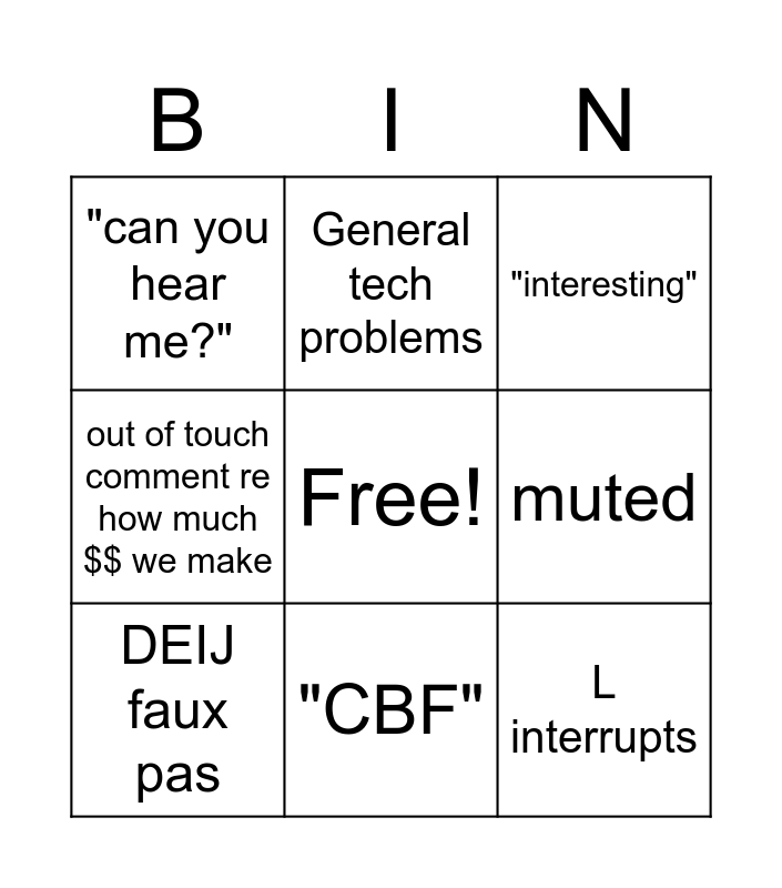 This bingo card has a free space and 8 words: muted, "interesting", General tech problems, DEIJ faux pas, "can you hear me?", L interrupts, out of touch comment re how much $$ we make and "CBF".