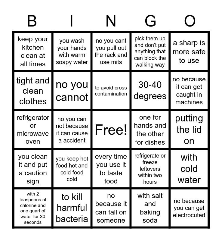 This bingo card has a free space and 24 words: you keep hot food hot and cold food cold, to kill harmful bacteria, to avoid cross contamination, with 2 teaspoons of chlorine and one quart of water for 30 seconds, a sharp is more safe to use, keep your kitchen clean at all times, tight and clean clothes, you wash your hands with warm soapy water, one for hands and the other for dishes, every time you use it to taste food, 30-40 degrees, refrigerator or microwave oven, refrigerate or freeze leftovers within two hours, with cold water, no you cannot, with salt and baking soda, putting the lid on, no you cant you pull out the rack and use mits, no because it can get caught in machines, no you can not because it can cause a accident, no because you can get electrocuted, you clean it and put a caution sign, pick them up and don't put anything that can block the walking way and no because it can fall on someone.