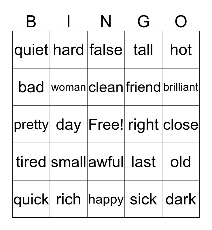 This bingo card has a free space and 24 words: small, rich, clean, quick, hot, quiet, bad, hard, right, awful, friend, pretty, last, old, woman, sick, close, false, brilliant, day, dark, tired, tall and happy.