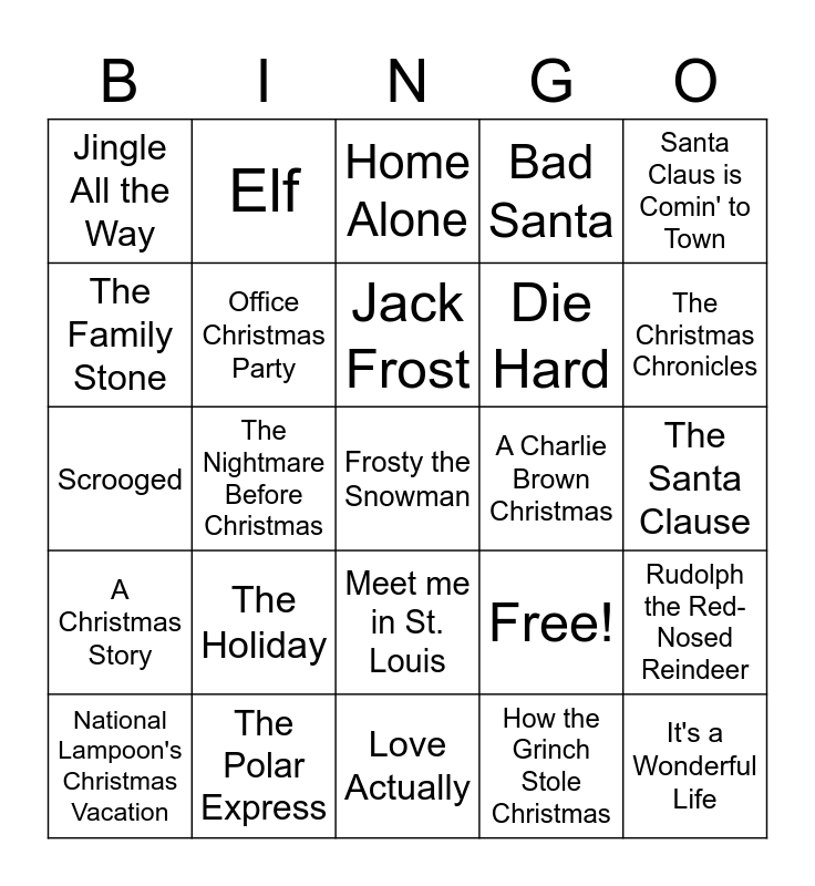 This bingo card has 27 words: Free!, It's a Wonderful Life, Die Hard, Love Actually, The Family Stone, Home Alone, Elf, A Christmas Story, A Charlie Brown Christmas, Rudolph the Red-Nosed Reindeer, Scrooged, Bad Santa, National Lampoon's Christmas Vacation, The Polar Express, The Christmas Chronicles, Four Christmases, Office Christmas Party, Jack Frost, The Holiday, Jingle All the Way, The Santa Clause, How the Grinch Stole Christmas, The Nightmare Before Christmas, Frosty the Snowman, Meet me in St. Louis, Santa Claus is Comin' to Town and Miracle on 34th Street.