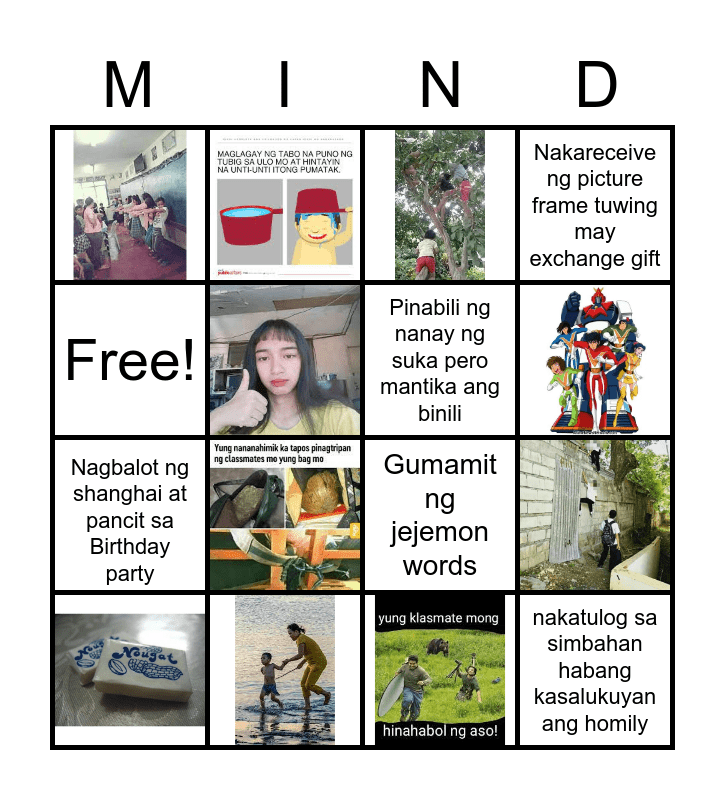 This bingo card has 10 images and 6 words: Nagbalot ng shanghai at pancit sa Birthday party, Gumamit ng jejemon words, Free!, Nakareceive ng picture frame tuwing may exchange gift, Pinabili ng nanay ng suka pero mantika ang binili and nakatulog sa simbahan habang kasalukuyan ang homily.