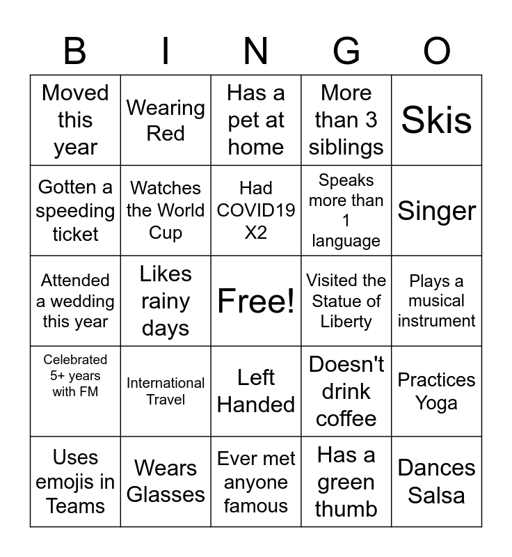 This bingo card has a free space and 24 words: International Travel, Wears Glasses, Had COVID19 X2, Uses emojis in Teams, Skis, Moved this year, Gotten a speeding ticket, Wearing Red, Visited the Statue of Liberty, Left Handed, Speaks more than 1 language, Attended a wedding this year, Doesn't drink coffee, Practices Yoga, Watches the World Cup, Has a green thumb, Plays a musical instrument, Has a pet at home, Singer, Likes rainy days, Dances Salsa, Celebrated 5+ years with FM, More than 3 siblings and Ever met anyone famous.