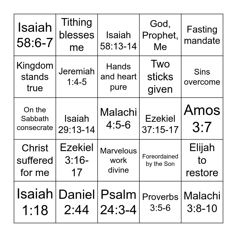 This bingo card has a free space and 29 words: Isaiah 1:18, Isaiah 5:20, Isaiah 29:13-14, Isaiah 53:3-5, Isaiah 58:6-7, Isaiah 58:13-14, Jeremiah 1:4-5, Ezekiel 3:16-17, Ezekiel 37:15-17, Daniel 2:44, Amos 3:7, Malachi 3:8-10, Psalm 24:3-4, Proverbs 3:5-6, Sins overcome, Evil connive, Marvelous work divine, Christ suffered for me, Fasting mandate, On the Sabbath consecrate, Foreordained by the Son, Gives warnings from Thee, Two sticks given, Kingdom stands true, God, Prophet, Me, Tithing blesses me, Elijah to restore, Hands and heart pure and Trust in Thee.
