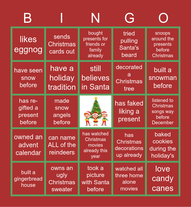 This bingo card has a free space and 24 words: can name ALL of the reindeers, owns an ugly Christmas sweater, still believes in Santa, built a gingerbread house, snoops around the presents before Christmas, likes eggnog, have seen snow before, sends Christmas cards out, has faked liking a present, has watched Christmas movies already this year, decorated a Christmas tree, has re-gifted a present before, has Christmas decorations up already, baked cookies during the holiday's, have a holiday tradition, watched all three home alone movies, listened to Christmas songs way before December, bought presents for friends or family already, built a snowman before, made snow angels before, love candy canes, owned an advent calendar, tried pulling Santa's beard and took a picture with Santa before.
