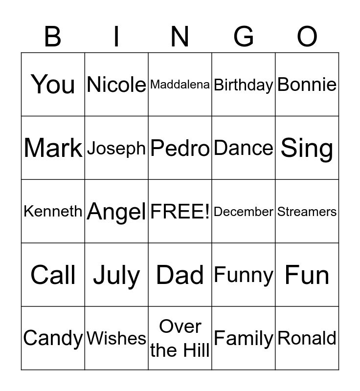 This bingo card has a free space and 75 words: Garth, Angela, Maddalena, Joan, Bernice, Jose, Martha, Byron, Hansfield, Eun Ran, Santiago, Veronica, Pedro, Mark, Junior, Angel, Gregory, Ronald, Jerome, Bonnie, Lawrence, Kenneth, Joseph, Nicole, Birthday, Card, Cake, Frosting, Card, Candle, Old, Young, Silly, Funny, Sing, Dance, Ice cream, Balloon, Streamers, Family, Friends, Gifts, Special, Cupcake, Boogie, Music, Candy, You, Me, Everyone, Mom, Dad, Sister, Brother, January, February, March, April, May, June, July, August, September, October, November, December, Together, Moves, Balloon, Fun, Call, Wishes, Grandparents, Over the Hill and Receiving.