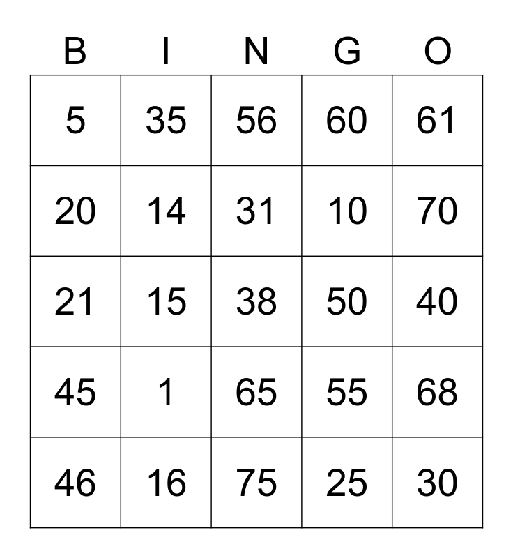 This bingo card has a free space and 24 words: 1, 16, 31, 46, 61, 5, 20, 35, 50, 65, 10, 21, 55, 68, 14, 25, 40, 56, 70, 15, 30, 45, 60 and 75.