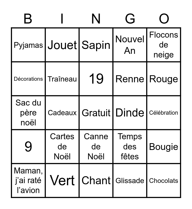 This bingo card has a free space and 70 words: Fête, Cadeaux, Bûche de Noël, Décembre, Célébration, Père Noël, Jouet, Houx, Renne, 25, Joyeux, 12, Sapin, Nouvel An, Réveillon, 9, Vert, 19, 23, Rouge, Maman, j’ai raté l’avion, Lutin, Chant, Temps des fêtes, Minuit, Étoile, Le Grincheux, Noël, Dinde, Solstice, Pyjamas, Cloches, Lumières, Bas de Noël, 21, Ornement, Neige, Bonhomme de Neige, Glissade, Flocons de neige, Froid, Cartes de Noël, Canne de Noël, Cheminée, Biscuits, Décorations, Chocolat Chaud, Mère Noël, Pôle Nord, Rudolph, Verre de Lait, Calendrier, Couronne, Tradition, Bougie, Champagne, Traîneau, Feu d’artifice, Rubans, Chocolats, Sac du père noël, Bonnet, Foulard, Pain d’Épice, Mitaines, 2023, Conte, Guirlande, Pantalon de Neige and Boule de Neige.