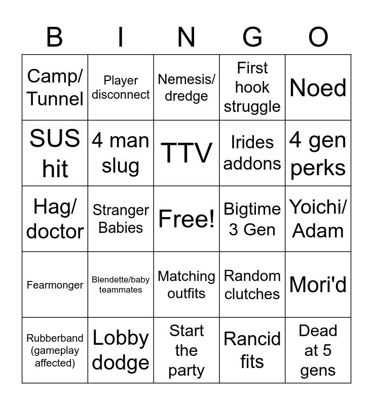 This bingo card has a free space and 24 words: Blendette/baby teammates, Lobby dodge, TTV, Rubberband (gameplay affected), Noed, Camp/ Tunnel, SUS hit, Player disconnect, Bigtime 3 Gen, Matching outfits, Irides addons, Hag/ doctor, Random clutches, Mori'd, 4 man slug, Rancid fits, Yoichi/ Adam, Nemesis/ dredge, 4 gen perks, Stranger Babies, Dead at 5 gens, Fearmonger, First hook struggle and Start the party.
