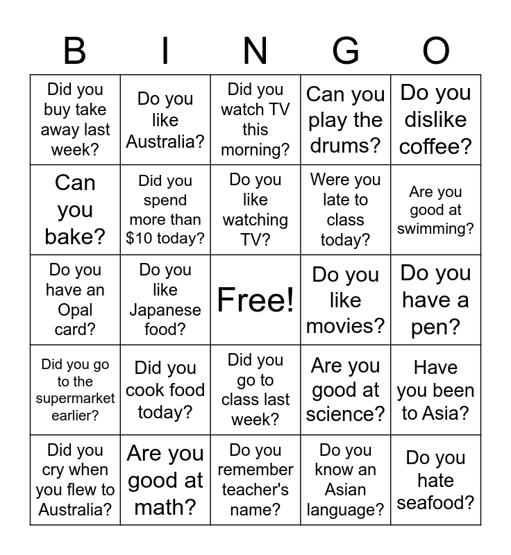This bingo card has a free space and 24 words: Did you cook food today?, Are you good at math?, Do you like watching TV?, Did you cry when you flew to Australia?, Do you dislike coffee?, Did you buy take away last week?, Can you bake?, Do you like Australia?, Do you like movies?, Did you go to class last week?, Were you late to class today?, Do you have an Opal card?, Are you good at science?, Have you been to Asia?, Did you spend more than $10 today?, Do you know an Asian language?, Do you have a pen?, Did you watch TV this morning?, Are you good at swimming?, Do you like Japanese food?, Do you hate seafood?, Did you go to the supermarket earlier?, Can you play the drums? and Do you remember teacher's name?.