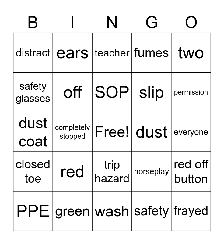 This bingo card has a free space and 24 words: red, green, SOP, PPE, two, distract, safety glasses, ears, dust, trip hazard, slip, dust coat, horseplay, red off button, off, safety, everyone, teacher, permission, completely stopped, frayed, closed toe, fumes and wash.