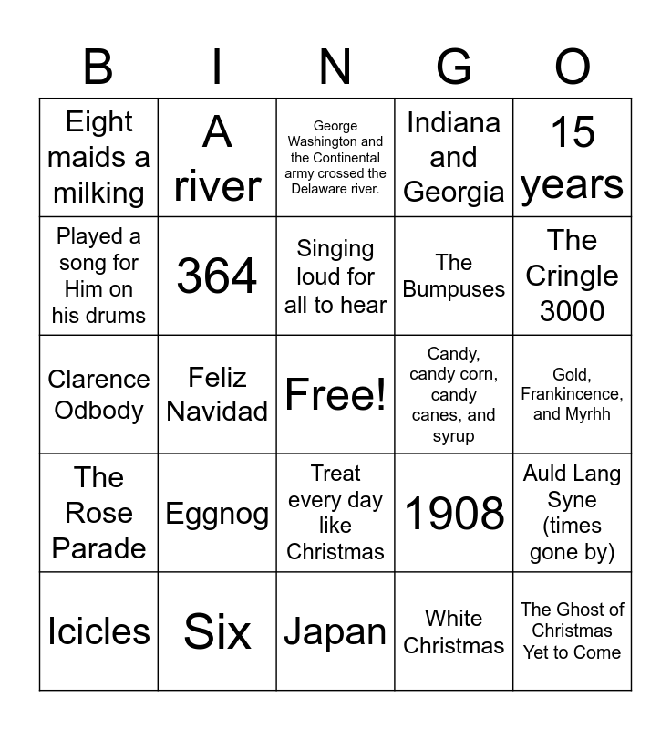 This bingo card has a free space and 26 words: Treat every day like Christmas, White Christmas, Singing loud for all to hear, Six, 15 years, Eight maids a milking, Played a song for Him on his drums, A river, Gold, Frankincence, and Myrhh, 1908, The Bumpuses, Clarence Odbody, Auld Lang Syne (times gone by), Icicles, Feliz Navidad, "Hark! The Herald Angels Sing", Indiana and Georgia, The Rose Parade, George Washington and the Continental army crossed the Delaware river., The Ghost of Christmas Yet to Come, The Cringle 3000, Japan, Candy, candy corn, candy canes, and syrup, Eggnog, 364 and 25,000.