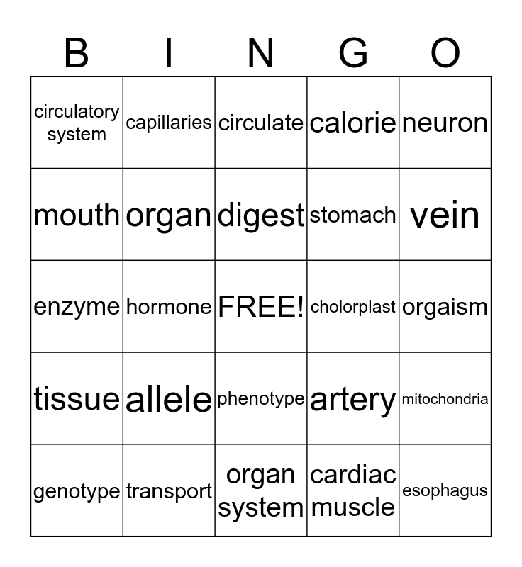 This bingo card has a free space and 24 words: allele, transport, digest, genotype, neuron, circulatory system, mouth, capillaries, cholorplast, phenotype, stomach, enzyme, artery, mitochondria, organ, cardiac muscle, orgaism, circulate, vein, hormone, esophagus, tissue, calorie and organ system.