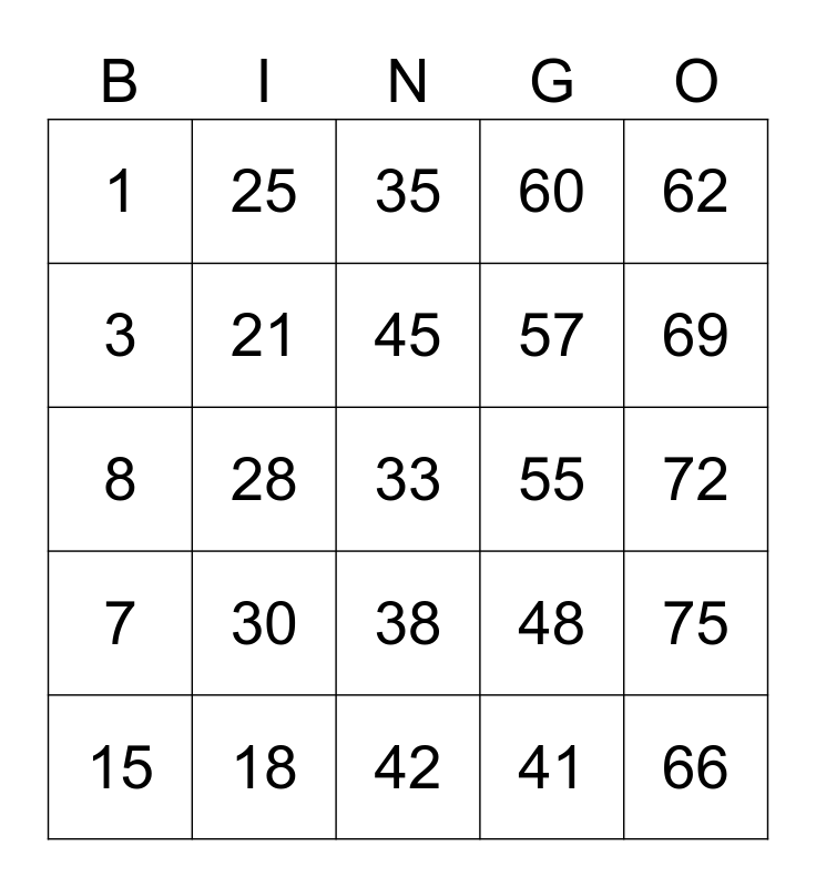 This bingo card has 25 words: 7, 18, 33, 41, 62, 1, 25, 35, 55, 75, 3, 21, 42, 48, 69, 15, 28, 45, 57, 72, 8, 30, 38, 60 and 66.