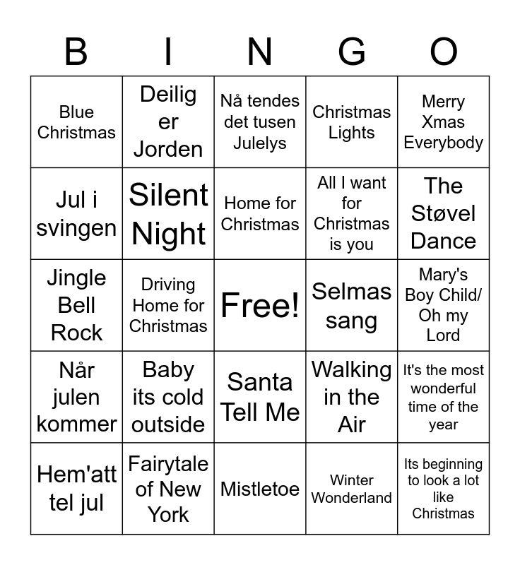 This bingo card has a free space and 37 words: Hallelujah, Himmel på Jord, Sleigh Ride, Silent Night, It's the most wonderful time of the year, Baby its cold outside, Home for Christmas, Du er ikke alene, Merry Xmas Everybody, Blålokk - 1.desember, Driving Home for Christmas, Christmas Lights, Its beginning to look a lot like Christmas, Mary's Boy Child/ Oh my Lord, Jul i svingen, Når julen kommer, Have yourself a Merry little Christmas, Nå tendes det tusen Julelys, Santa Tell Me, Selmas sang, Blue Christmas, The Støvel Dance, Hem'att tel jul, Mistletoe, Santa Baby, Winter Wonderland, Deilig er Jorden, Happy New YearSnowman, Merry Christmas, Rockin around the Christmas tree, Last Christmas, Fairytale of New York, Jingle Bell Rock, Feliz Navidad, Walking in the Air, All I want for Christmas is you and Let it Snow! Let it Snow! Let it Snow.