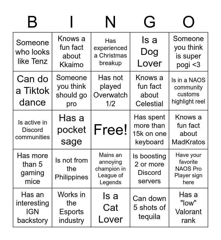 This bingo card has a free space and 52 words: A great dancer, Has a "low" Valorant rank, Has a "high" Valorant rank, Is a Cat Lover, Is not from the Philippines, Is a pocket sage, Knows a fun fact about Kkaimo, A great singer, Can do a Tiktok dance, Was at ConQuest 2022, Someone you think should go pro, Knows a fun fact about Depulse, Have your favorite NAOS Pro Player sign here, Is boosting 2 or more Discord servers, Only plays one character in a video game, Is not from Luzon, Has not played Overwatch 1/2, Has spent more than 15k on one keyboard, Knows a fun fact about Kurimeow, Someone you think is super pogi <3, Has a pocket sage, Can down 5 shots of tequila, Someone who looks like Tenz, Knows a fun fact about Celestial, Was/is in a varsity team, Is secretly toxic in-game, Owns a maid outfit, Has a unique pet, Is in a NAOS community customs highlight reel, Is a Twitch affiliate (NAOS CCs not counted), Has the same Valorant rank as you, Is a Dog Lover, Someone you think is super ganda <3, Knows a fun fact about Janelley, Is a WHALE (high gacha spender), Has experienced a Christmas breakup, Works in the Esports industry, Knows a fun fact about Amara, Has the same favorite anime as you, A cosplayer, Was at ESGS2022, Knows a fun fact about MadKratos, Has more than 5 gaming mice, Knows a fun fact about KAFI, Mains an annoying champion in League of Legends, Has played in an esports tournament, Is 30 years old or more, Is active in Discord communities, Has an allergy to something, Knows a fun fact about Calii, Has an interesting IGN backstory and Is looking for a "ka-duo".