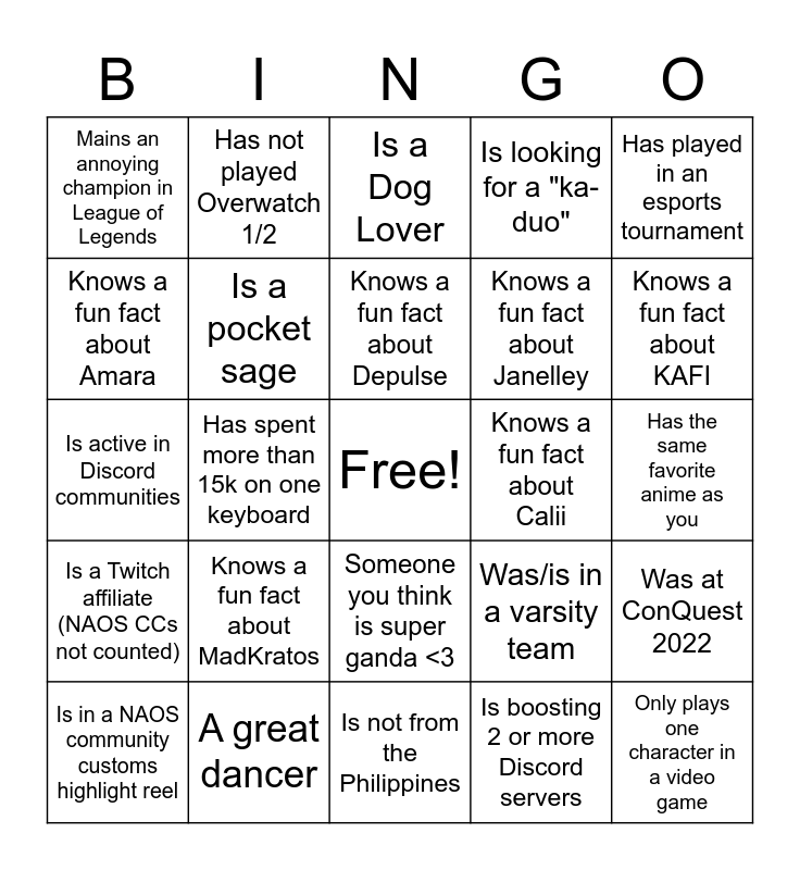 This bingo card has a free space and 52 words: Is secretly toxic in-game, Only plays one character in a video game, Have your favorite NAOS Pro Player sign here, Is not from the Philippines, Knows a fun fact about MadKratos, Has an interesting IGN backstory, Has not played Overwatch 1/2, Was at ESGS2022, Knows a fun fact about Amara, Has the same Valorant rank as you, Is a pocket sage, Knows a fun fact about Kurimeow, Was at ConQuest 2022, Was/is in a varsity team, Has a "low" Valorant rank, Can down 5 shots of tequila, Knows a fun fact about Depulse, Knows a fun fact about Calii, Has an allergy to something, Has played in an esports tournament, Has spent more than 15k on one keyboard, Is boosting 2 or more Discord servers, Mains an annoying champion in League of Legends, Knows a fun fact about Janelley, Knows a fun fact about Kkaimo, Someone who looks like Tenz, A great singer, Is 30 years old or more, Knows a fun fact about KAFI, Is not from Luzon, Knows a fun fact about Celestial, Is looking for a "ka-duo", Has a "high" Valorant rank, Has experienced a Christmas breakup, Has a pocket sage, Is a Dog Lover, A great dancer, Is a Cat Lover, Has more than 5 gaming mice, Can do a Tiktok dance, Is a WHALE (high gacha spender), Has the same favorite anime as you, Is a Twitch affiliate (NAOS CCs not counted), Owns a maid outfit, Someone you think is super ganda <3, Works in the Esports industry, Someone you think should go pro, Is active in Discord communities, A cosplayer, Someone you think is super pogi <3, Is in a NAOS community customs highlight reel and Has a unique pet.