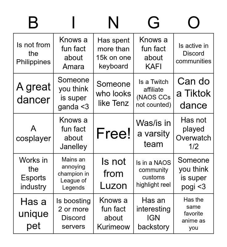 This bingo card has a free space and 52 words: Is secretly toxic in-game, Has the same favorite anime as you, Owns a maid outfit, Knows a fun fact about Kurimeow, Mains an annoying champion in League of Legends, Knows a fun fact about Depulse, Knows a fun fact about Amara, Has played in an esports tournament, A great dancer, Has a "high" Valorant rank, Someone you think is super ganda <3, Knows a fun fact about Kkaimo, Someone you think is super pogi <3, Is in a NAOS community customs highlight reel, Has a pocket sage, Has an allergy to something, Someone who looks like Tenz, Was/is in a varsity team, Has the same Valorant rank as you, Is active in Discord communities, Knows a fun fact about Janelley, Has an interesting IGN backstory, Is not from the Philippines, Is a Twitch affiliate (NAOS CCs not counted), Is a pocket sage, Is looking for a "ka-duo", Someone you think should go pro, Has a "low" Valorant rank, Can do a Tiktok dance, Only plays one character in a video game, A great singer, Knows a fun fact about KAFI, Has more than 5 gaming mice, Is a Cat Lover, Is 30 years old or more, Has spent more than 15k on one keyboard, Is boosting 2 or more Discord servers, Has experienced a Christmas breakup, Knows a fun fact about Calii, Was at ESGS2022, Can down 5 shots of tequila, Has not played Overwatch 1/2, Works in the Esports industry, Knows a fun fact about Celestial, Is not from Luzon, Have your favorite NAOS Pro Player sign here, Is a WHALE (high gacha spender), A cosplayer, Knows a fun fact about MadKratos, Is a Dog Lover, Has a unique pet and Was at ConQuest 2022.