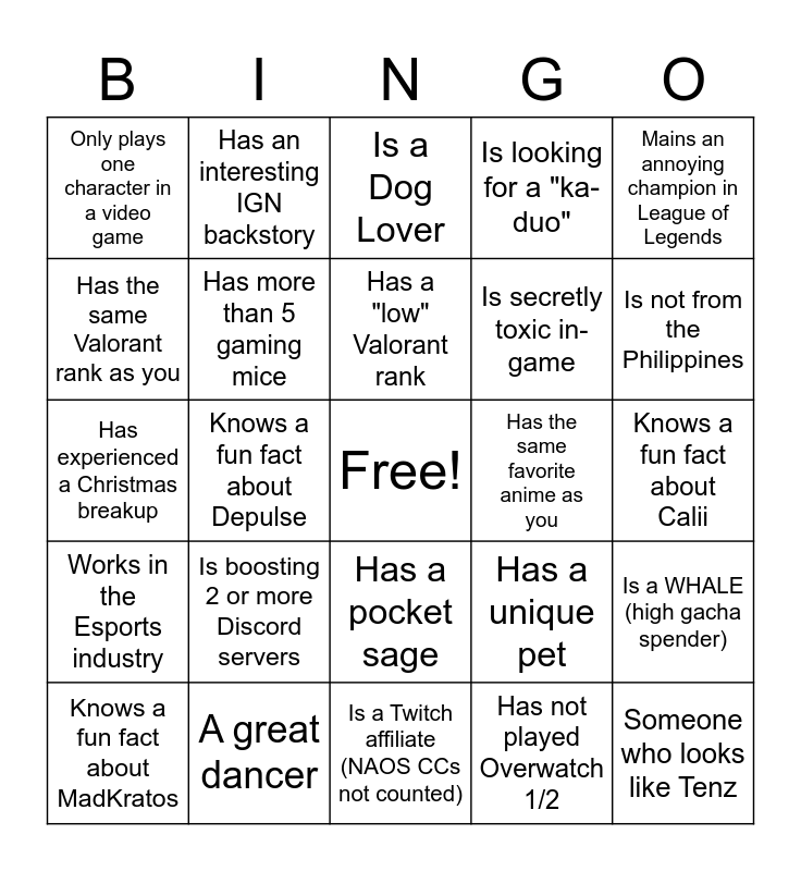 This bingo card has a free space and 52 words: Someone you think should go pro, Someone who looks like Tenz, A great singer, Is a Twitch affiliate (NAOS CCs not counted), Is boosting 2 or more Discord servers, Knows a fun fact about Celestial, Has an interesting IGN backstory, Knows a fun fact about Amara, Has the same Valorant rank as you, Someone you think is super pogi <3, Has more than 5 gaming mice, Is 30 years old or more, Is a WHALE (high gacha spender), Has a unique pet, Was at ConQuest 2022, Has spent more than 15k on one keyboard, Has a "low" Valorant rank, Has the same favorite anime as you, Is a pocket sage, Mains an annoying champion in League of Legends, Knows a fun fact about Depulse, Has not played Overwatch 1/2, Only plays one character in a video game, Is secretly toxic in-game, A cosplayer, Someone you think is super ganda <3, Can down 5 shots of tequila, Knows a fun fact about KAFI, Is not from the Philippines, Is in a NAOS community customs highlight reel, Knows a fun fact about Kurimeow, Is looking for a "ka-duo", Knows a fun fact about Kkaimo, Was/is in a varsity team, Is a Cat Lover, Is a Dog Lover, A great dancer, Owns a maid outfit, Has an allergy to something, Was at ESGS2022, Have your favorite NAOS Pro Player sign here, Knows a fun fact about Calii, Works in the Esports industry, Has played in an esports tournament, Has a pocket sage, Can do a Tiktok dance, Is active in Discord communities, Has experienced a Christmas breakup, Has a "high" Valorant rank, Knows a fun fact about Janelley, Knows a fun fact about MadKratos and Is not from Luzon.