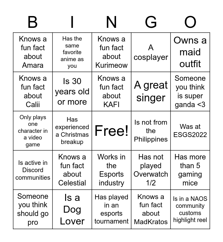 This bingo card has a free space and 52 words: Is a Twitch affiliate (NAOS CCs not counted), Is in a NAOS community customs highlight reel, Has spent more than 15k on one keyboard, Has played in an esports tournament, Knows a fun fact about Celestial, Has a unique pet, Has the same favorite anime as you, A great dancer, Knows a fun fact about Calii, Can do a Tiktok dance, Is 30 years old or more, Knows a fun fact about Kkaimo, Has more than 5 gaming mice, Has not played Overwatch 1/2, Has a pocket sage, Is looking for a "ka-duo", Knows a fun fact about KAFI, Is not from the Philippines, Has an allergy to something, Owns a maid outfit, Has experienced a Christmas breakup, Knows a fun fact about MadKratos, Knows a fun fact about Amara, A great singer, Was/is in a varsity team, Has a "high" Valorant rank, Is a Cat Lover, Has an interesting IGN backstory, Someone you think is super ganda <3, Knows a fun fact about Depulse, Have your favorite NAOS Pro Player sign here, A cosplayer, Can down 5 shots of tequila, Is a pocket sage, Someone you think is super pogi <3, Knows a fun fact about Kurimeow, Is a Dog Lover, Was at ConQuest 2022, Has the same Valorant rank as you, Knows a fun fact about Janelley, Mains an annoying champion in League of Legends, Was at ESGS2022, Is active in Discord communities, Has a "low" Valorant rank, Works in the Esports industry, Is secretly toxic in-game, Is a WHALE (high gacha spender), Only plays one character in a video game, Is not from Luzon, Is boosting 2 or more Discord servers, Someone you think should go pro and Someone who looks like Tenz.