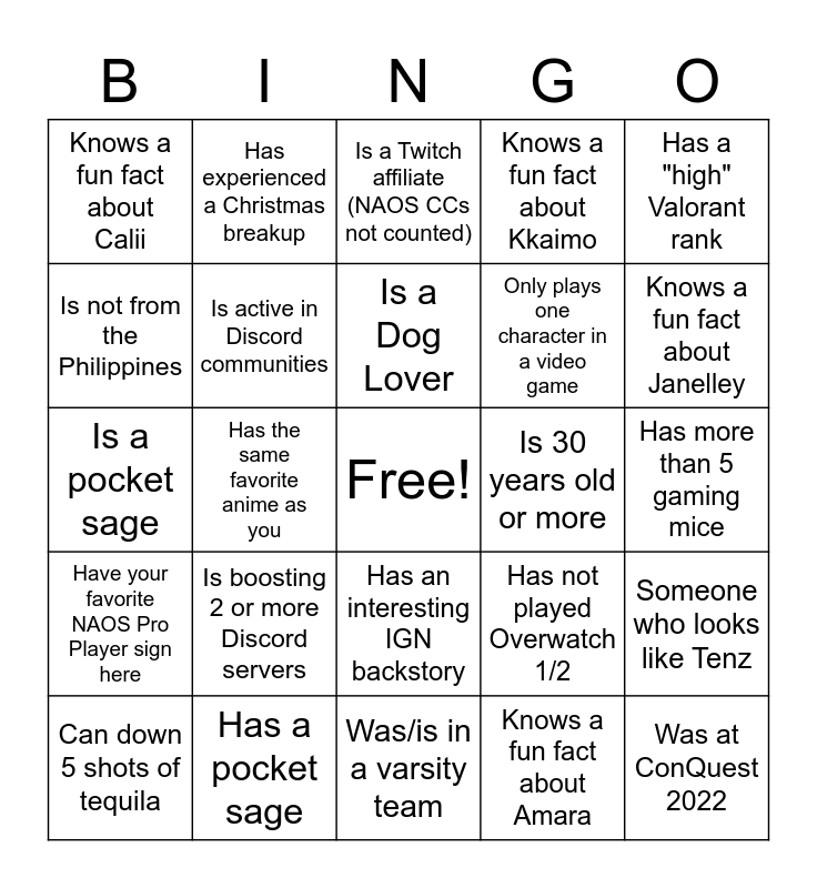 This bingo card has a free space and 52 words: Knows a fun fact about Kurimeow, Was at ConQuest 2022, A great singer, Was/is in a varsity team, Is boosting 2 or more Discord servers, Is a WHALE (high gacha spender), Has experienced a Christmas breakup, Knows a fun fact about KAFI, Is not from the Philippines, A cosplayer, Is active in Discord communities, Has the same Valorant rank as you, Someone who looks like Tenz, Has not played Overwatch 1/2, Someone you think is super ganda <3, Can do a Tiktok dance, Is a Dog Lover, Is 30 years old or more, Knows a fun fact about MadKratos, Has a "high" Valorant rank, Has the same favorite anime as you, Knows a fun fact about Amara, Knows a fun fact about Calii, Only plays one character in a video game, Is looking for a "ka-duo", A great dancer, Has a unique pet, Mains an annoying champion in League of Legends, Knows a fun fact about Janelley, Works in the Esports industry, Was at ESGS2022, Knows a fun fact about Kkaimo, Is not from Luzon, Knows a fun fact about Celestial, Is secretly toxic in-game, Is a Twitch affiliate (NAOS CCs not counted), Has a pocket sage, Knows a fun fact about Depulse, Has an allergy to something, Is a Cat Lover, Someone you think is super pogi <3, Has more than 5 gaming mice, Have your favorite NAOS Pro Player sign here, Someone you think should go pro, Has an interesting IGN backstory, Is in a NAOS community customs highlight reel, Has spent more than 15k on one keyboard, Is a pocket sage, Owns a maid outfit, Has played in an esports tournament, Can down 5 shots of tequila and Has a "low" Valorant rank.