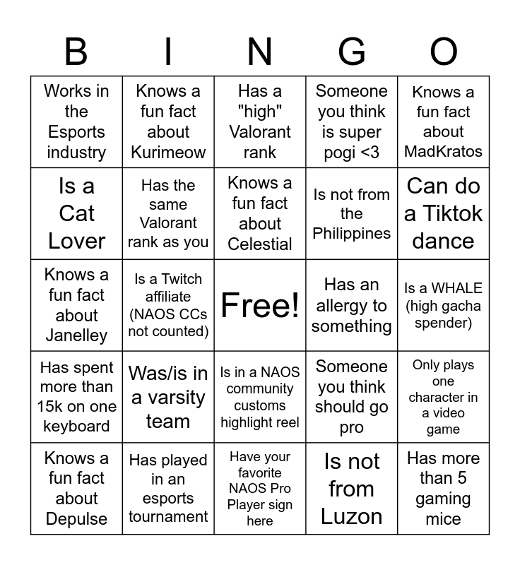 This bingo card has a free space and 52 words: Has not played Overwatch 1/2, Has more than 5 gaming mice, A cosplayer, Have your favorite NAOS Pro Player sign here, Was/is in a varsity team, Was at ESGS2022, Knows a fun fact about Kurimeow, Has experienced a Christmas breakup, Is a Cat Lover, Can down 5 shots of tequila, Has the same Valorant rank as you, Knows a fun fact about Amara, Only plays one character in a video game, Someone you think should go pro, Has a pocket sage, Someone who looks like Tenz, Knows a fun fact about Celestial, Has an allergy to something, Knows a fun fact about Kkaimo, Knows a fun fact about MadKratos, Is a Twitch affiliate (NAOS CCs not counted), Is not from Luzon, Works in the Esports industry, Is not from the Philippines, Has the same favorite anime as you, Is boosting 2 or more Discord servers, Knows a fun fact about KAFI, Mains an annoying champion in League of Legends, Can do a Tiktok dance, Is 30 years old or more, Has a "low" Valorant rank, Someone you think is super pogi <3, Is active in Discord communities, A great singer, Is looking for a "ka-duo", Has a "high" Valorant rank, Has played in an esports tournament, Was at ConQuest 2022, Is a Dog Lover, Is secretly toxic in-game, Has an interesting IGN backstory, Is a WHALE (high gacha spender), Has spent more than 15k on one keyboard, Knows a fun fact about Calii, Is in a NAOS community customs highlight reel, A great dancer, Someone you think is super ganda <3, Knows a fun fact about Janelley, Owns a maid outfit, Is a pocket sage, Knows a fun fact about Depulse and Has a unique pet.