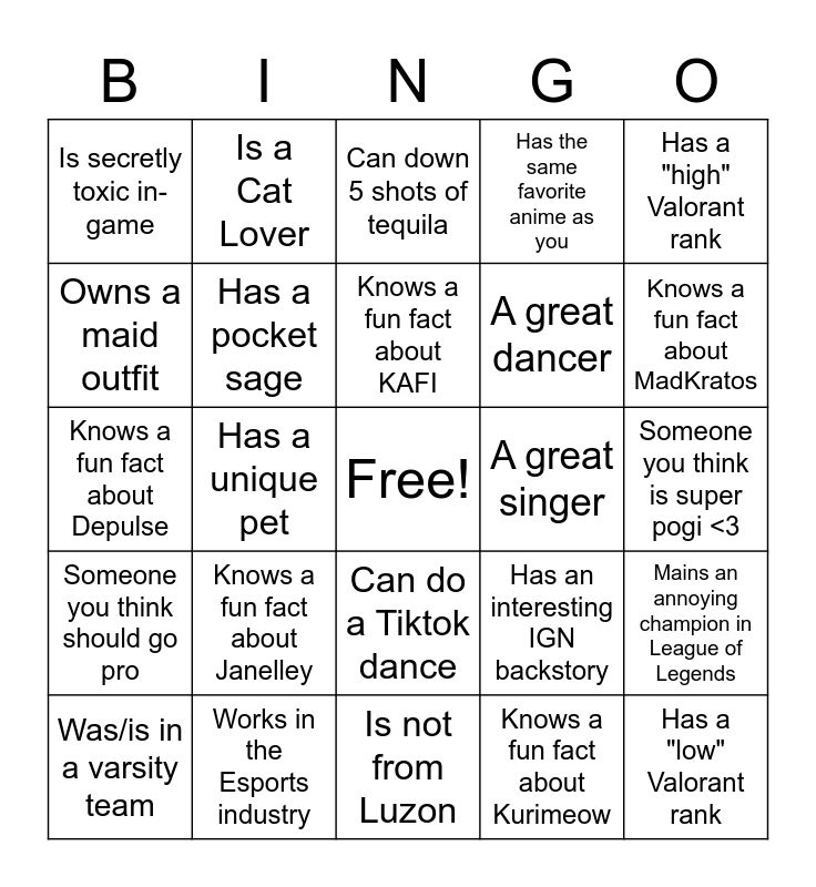 This bingo card has a free space and 52 words: Was at ESGS2022, Has a "low" Valorant rank, Knows a fun fact about Kkaimo, Is not from Luzon, Knows a fun fact about Janelley, Is a WHALE (high gacha spender), Is a Cat Lover, Knows a fun fact about Calii, Owns a maid outfit, Is boosting 2 or more Discord servers, Has a pocket sage, Is a Twitch affiliate (NAOS CCs not counted), Mains an annoying champion in League of Legends, Has an interesting IGN backstory, Knows a fun fact about Celestial, Has experienced a Christmas breakup, Knows a fun fact about KAFI, A great singer, Has the same Valorant rank as you, Has a "high" Valorant rank, Has a unique pet, Knows a fun fact about Kurimeow, Is secretly toxic in-game, A great dancer, Is looking for a "ka-duo", Is in a NAOS community customs highlight reel, Has spent more than 15k on one keyboard, Was at ConQuest 2022, Knows a fun fact about MadKratos, Is a Dog Lover, Is a pocket sage, Has the same favorite anime as you, Knows a fun fact about Amara, Has not played Overwatch 1/2, Someone you think is super ganda <3, Can down 5 shots of tequila, Works in the Esports industry, Has played in an esports tournament, Has an allergy to something, Has more than 5 gaming mice, Only plays one character in a video game, Someone you think is super pogi <3, Someone you think should go pro, Is active in Discord communities, Can do a Tiktok dance, Is not from the Philippines, A cosplayer, Knows a fun fact about Depulse, Someone who looks like Tenz, Is 30 years old or more, Was/is in a varsity team and Have your favorite NAOS Pro Player sign here.