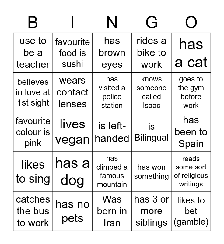 This bingo card has 45 words: walks to work, is left-handed, is an only child, catches the bus to work, has lived in another country, has 3 or more siblings, has brown eyes, plays a musical instrument, has a cat, has no pets, rides a bike to work, is Bilingual, has climbed a famous mountain, has a dog, has naturally straight hair, Was born in Iran, favourite food is pizza, favourite colour is pink, was born in winter, goes to the gym before work, favourite food is sushi, has naturally curly hair, is on a dating app, use to be a teacher, has more than 3 kids, has been to Spain, has broken a bone, has taken dance lessons, has won something, likes to sing, writes poems/songs, reads some sort of religious writings, enjoys camping, knows how to knit, likes to buy 2nd hand, lives vegan, blocked someone on social media, can make you laugh, likes to bet (gamble), has visited a police station, believes in love at 1st sight, knows someone called Isaac, shirt/dress was made in Australia, wears contact lenses and doesn't have a middle name.